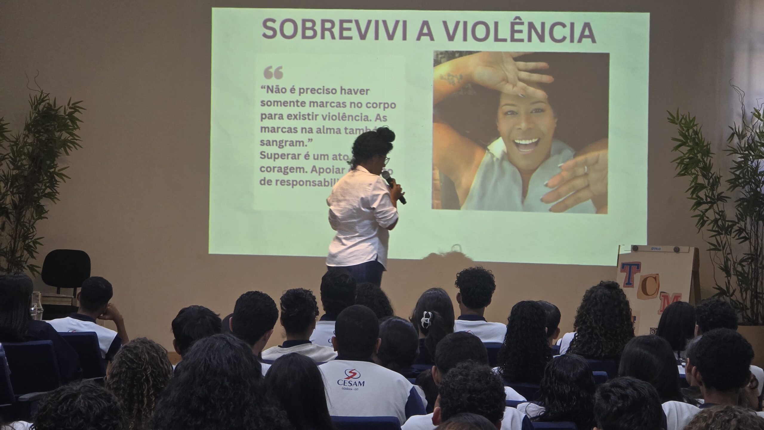 Nos últimos dias, ela realizou quatro palestras em um Cesam de Goiânia, conversando com estudantes sobre violência doméstica e os diferentes tipos de abuso.